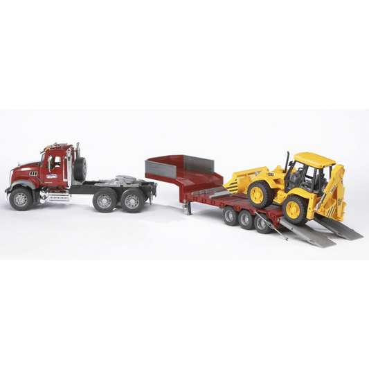 Camión MACK Granite con plataforma baja y JCB 4CX 02813- Escala 1:16- BRUDER